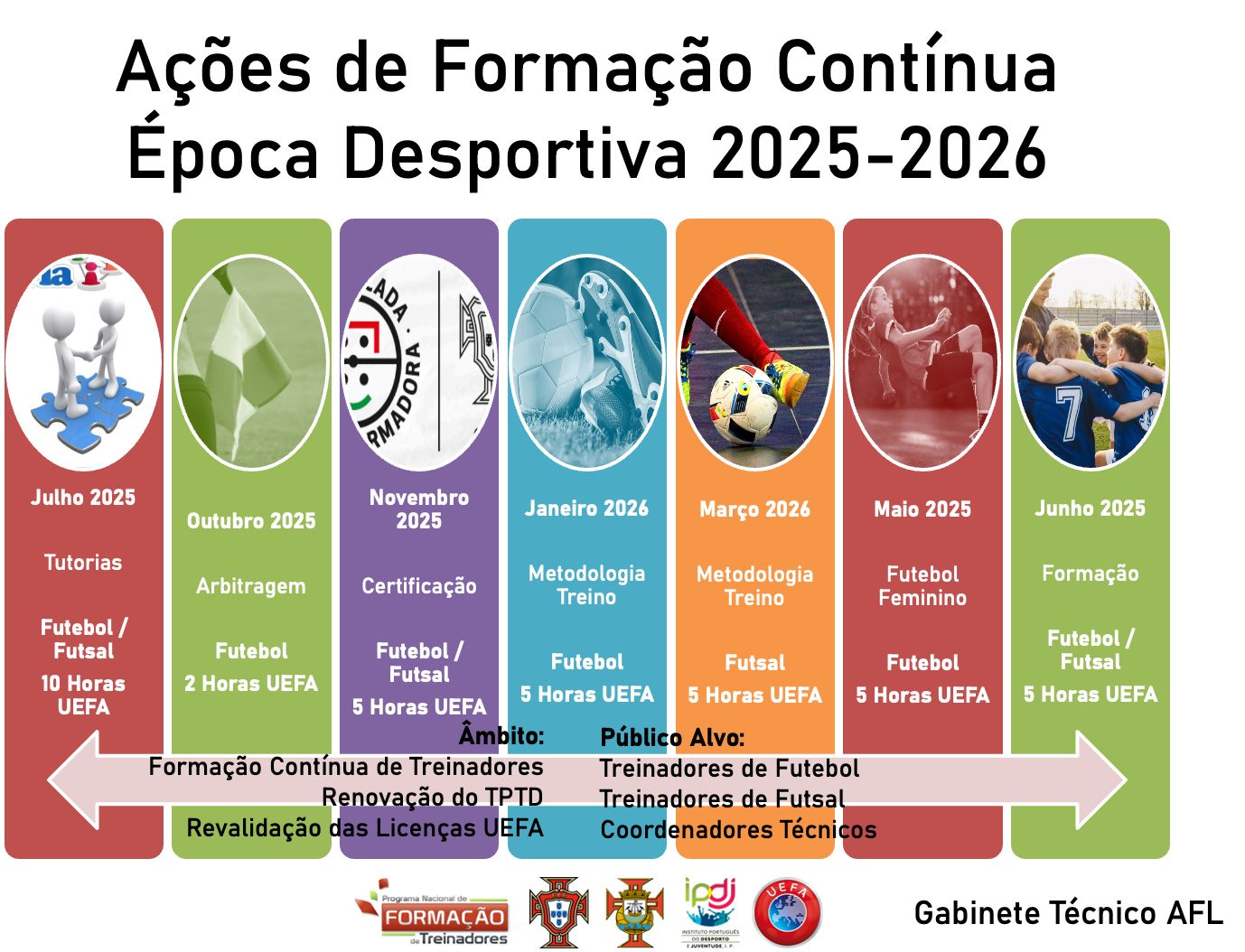 Formações Contínuas de Treinadores Plano de Formações Contínuas a realizar na Época Desportiva 2025/2026. As informações relativas a cada Formação (Data, Horário, Local, Inscrição) serão disponibilizadas no nosso Site no mês anterior à realização de cada Formação.